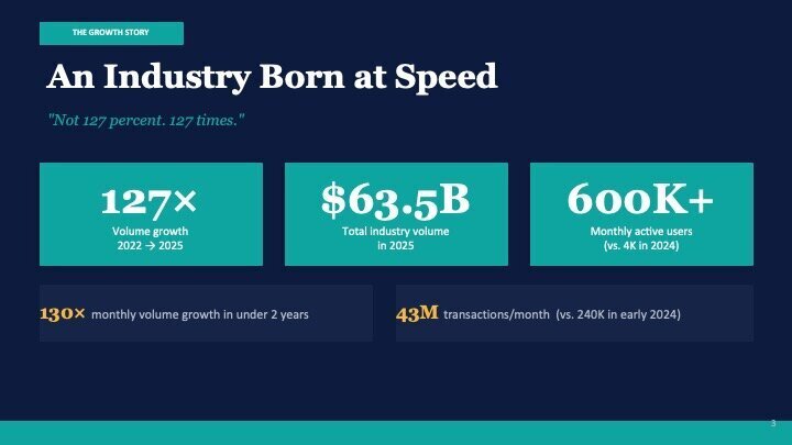 In 2022, total industry volume was approximately $0.5 billion. By 2025, it had reached $63.5 billion. That is a 127-fold increase in three years. Not 127 percent. 127 times. 12,700%.