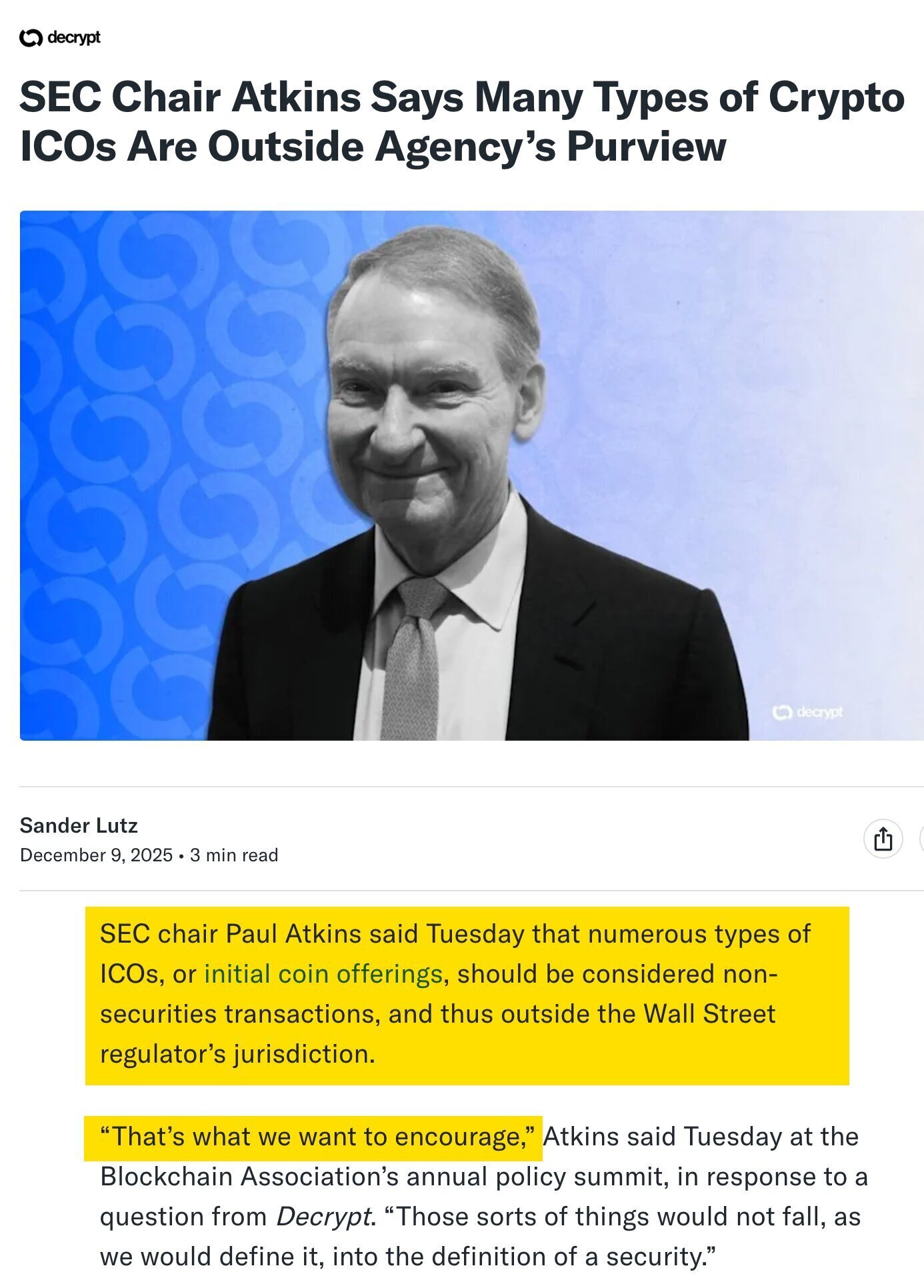 Earlier this month, Paul Atkins, the Chairman of the Securities and Exchange Commission, explicitly confirmed his position that his agency no longer intends to block most ICOs: