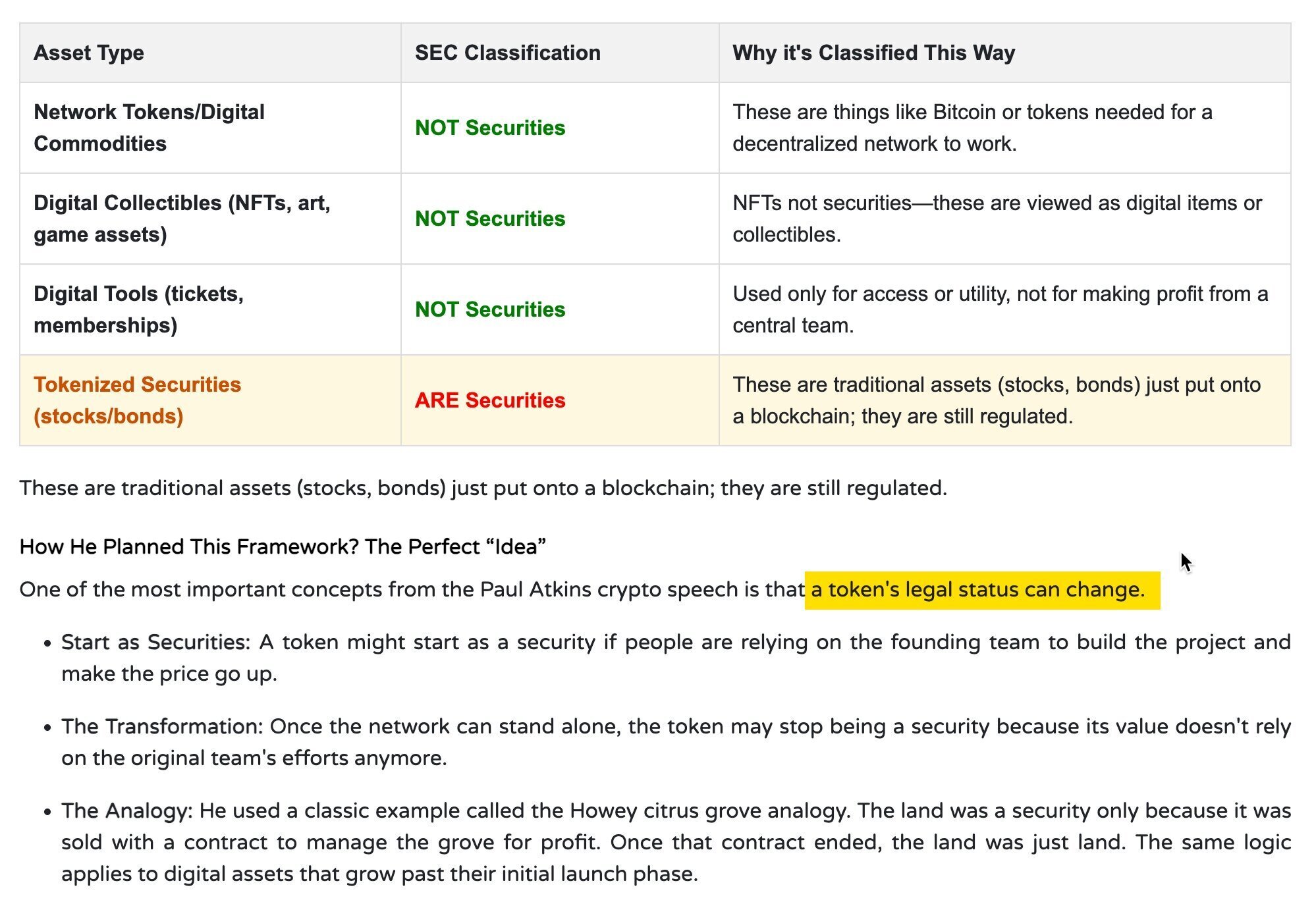On July 31, Chairman Atkins stated that most cryptocurrencies are “not securities” and instructed the SEC to “swiftly develop” the new regulation, but it has not been released yet.“