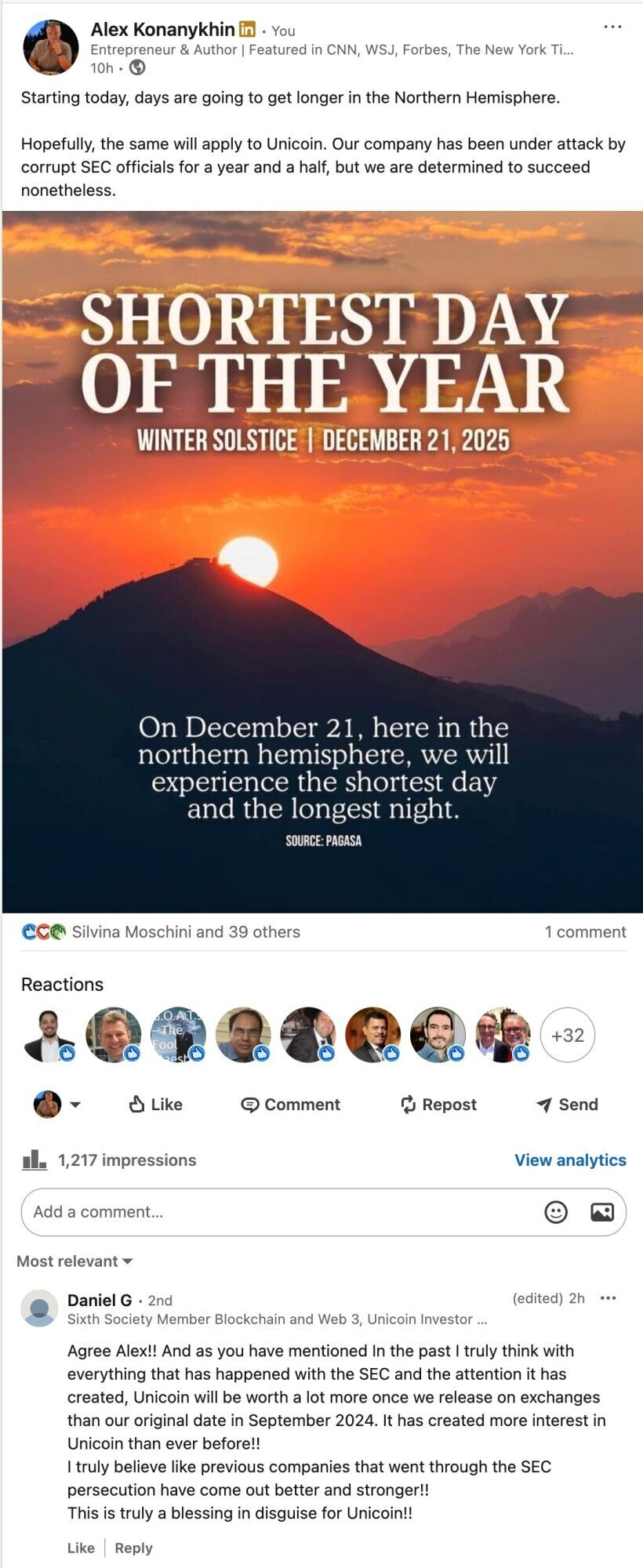 “… I truly think with everything that has happened with the SEC and the attention it has created, Unicoin will be worth a lot more once we release on exchanges than our original date in September 2024. It has created more interest in Unicoin than ever before!!